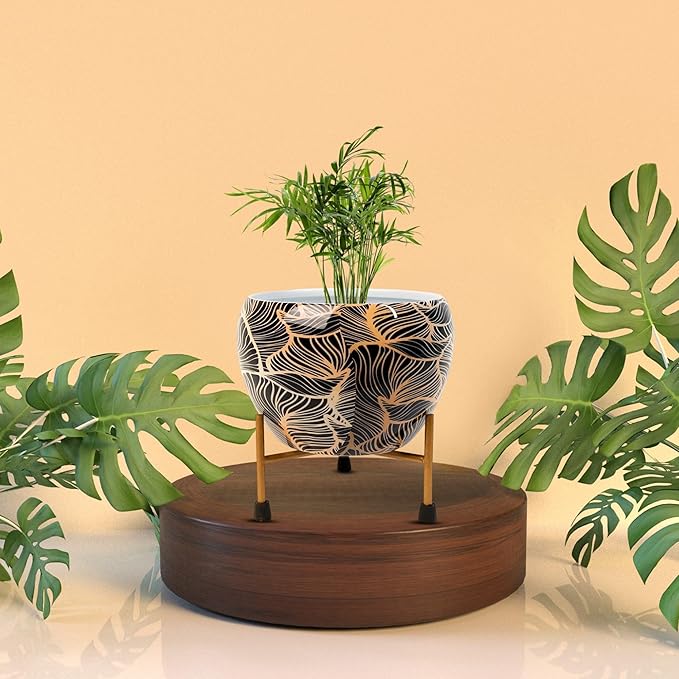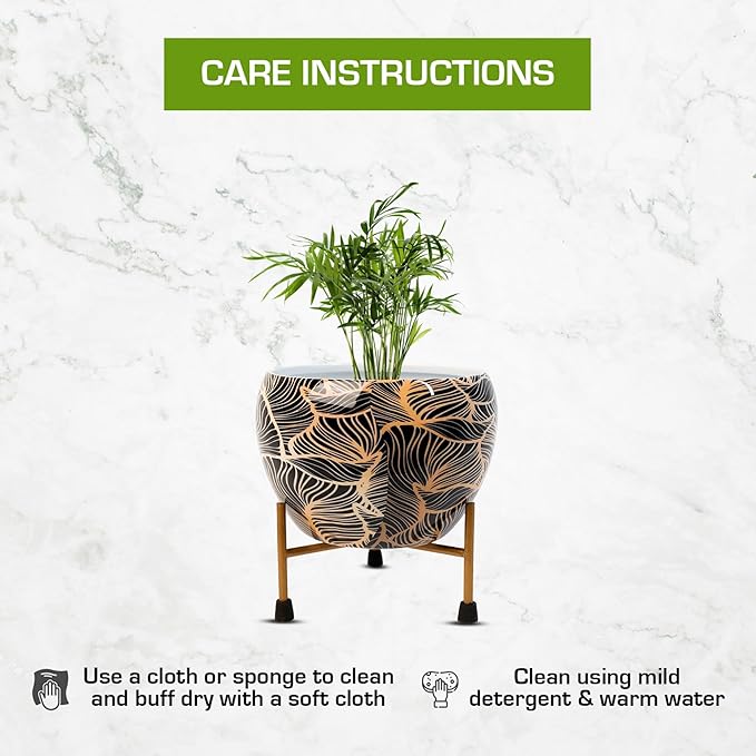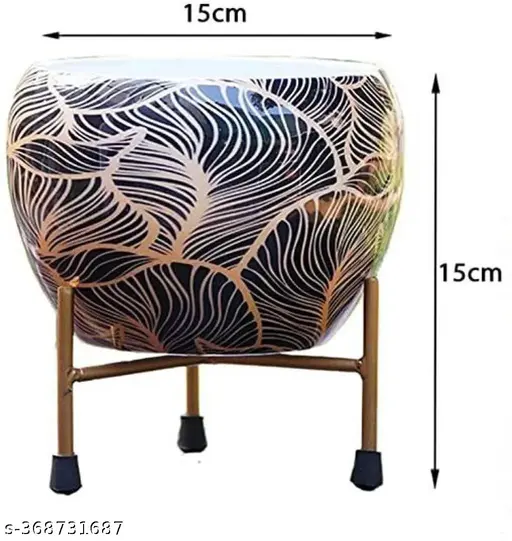 Add a bold, artistic touch to your indoor decor with this striking black and gold metal planter with stand. Featuring an elegant leaf-inspired gold pattern on a sleek black base, this planter brings a modern, luxurious feel to any room. Its sturdy, elevated metal stand enhances the presentation while offering excellent drainage space. Perfect for succulents, small plants, or even faux greenery, this piece is as functional as it is beautiful—ideal for coffee tables, desks, shelves, or entryways, countertops. Pot Ht. 7 cm, Pot Dia. 13 cm, Pot Ht. 10 cm. Indoor Plant Pot-Small