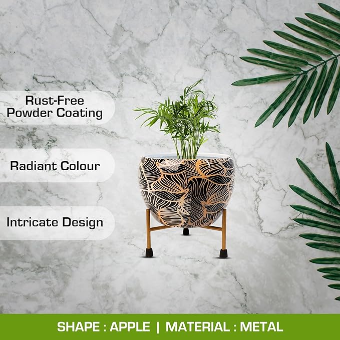 Decorative Apple Shape Metal Planter with Stand – Black &White Leaf Pattern
