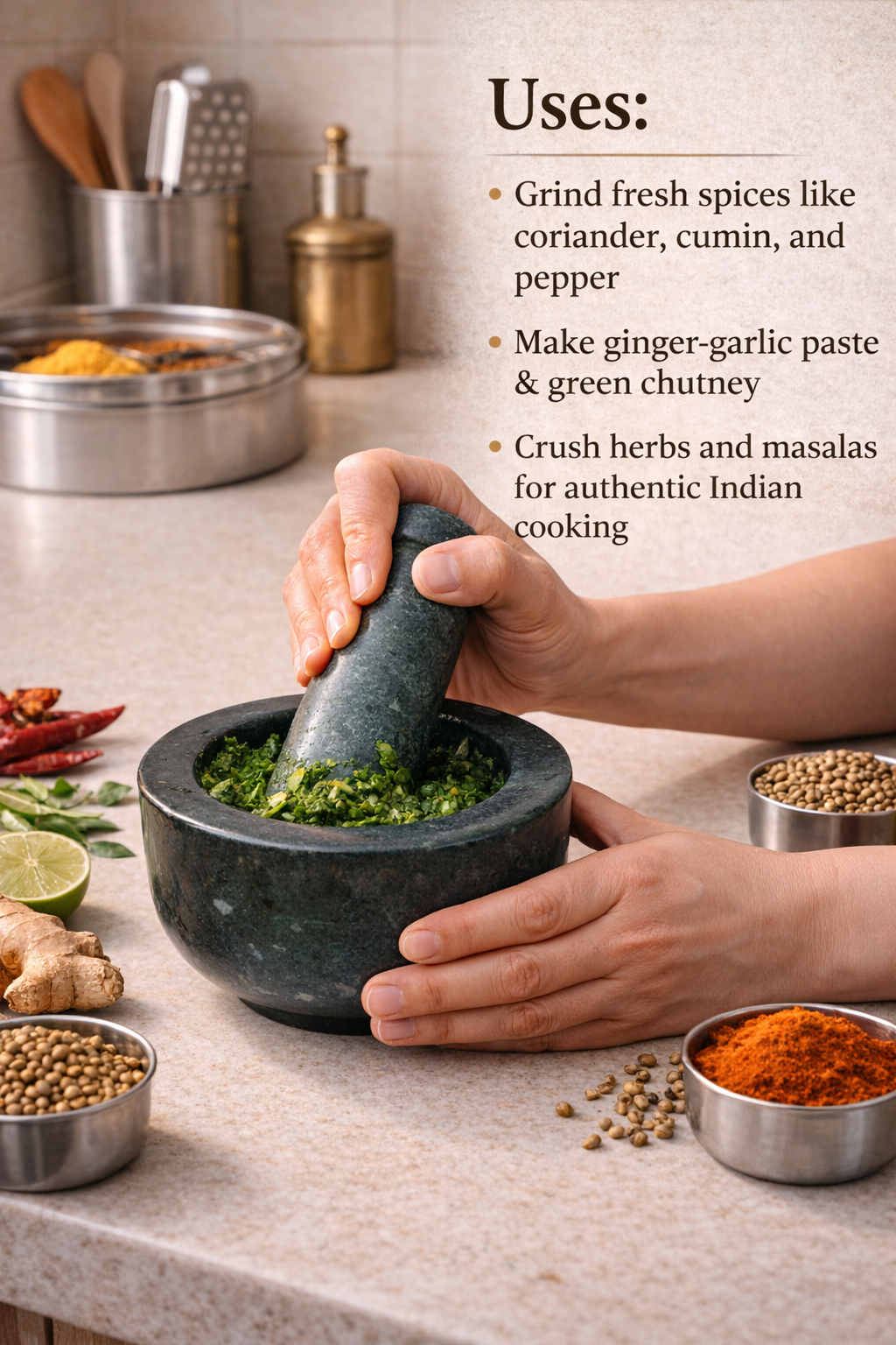 Perfect for everyday cooking, this compact yet powerful mortar and pestle is a must-have for Indian kitchens that value freshness and authenticity.