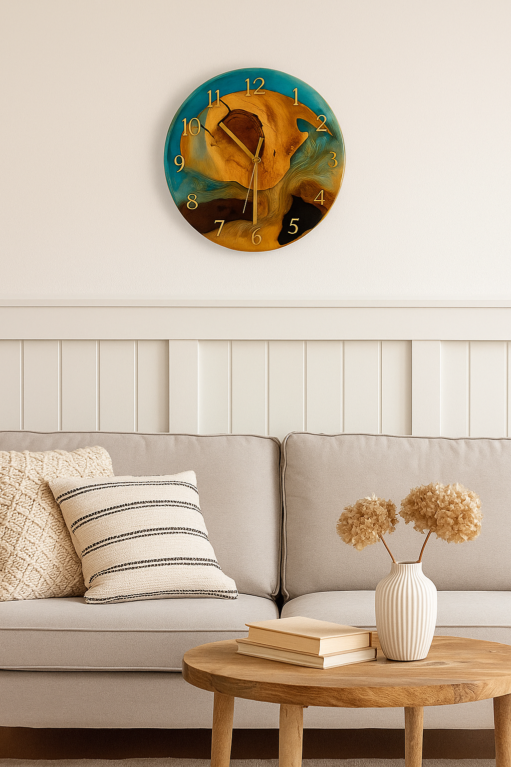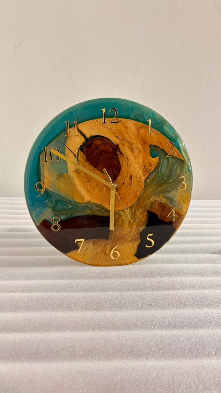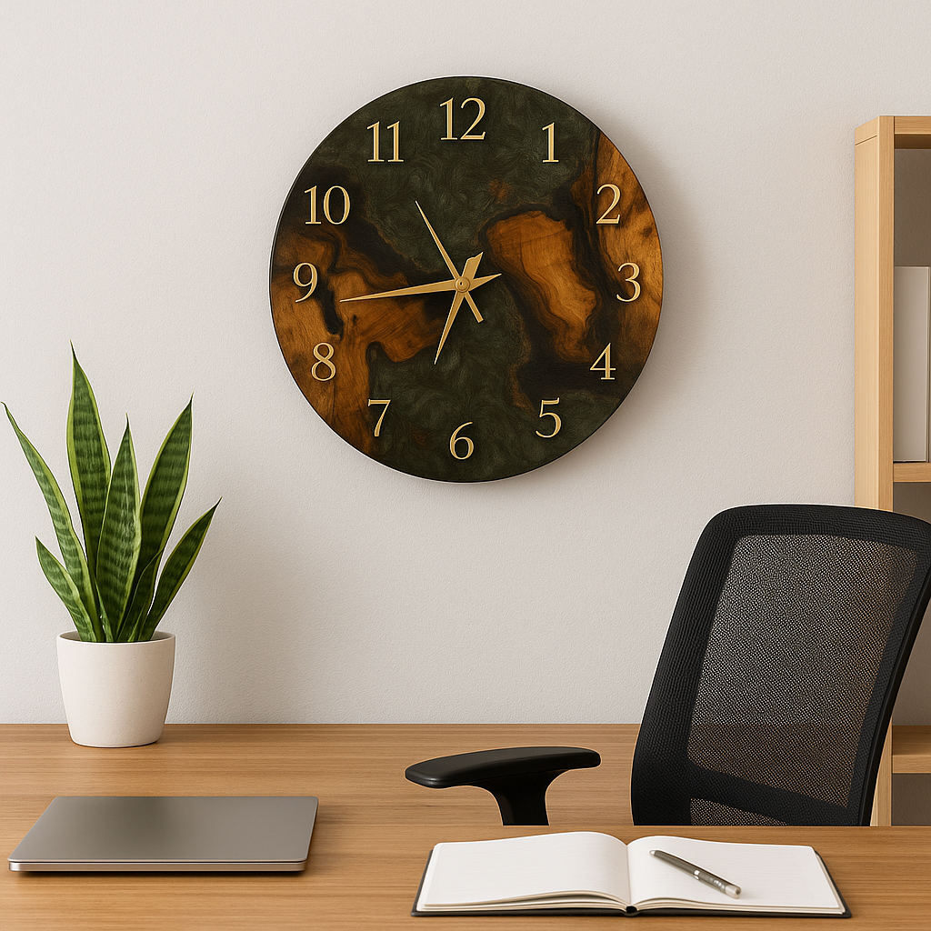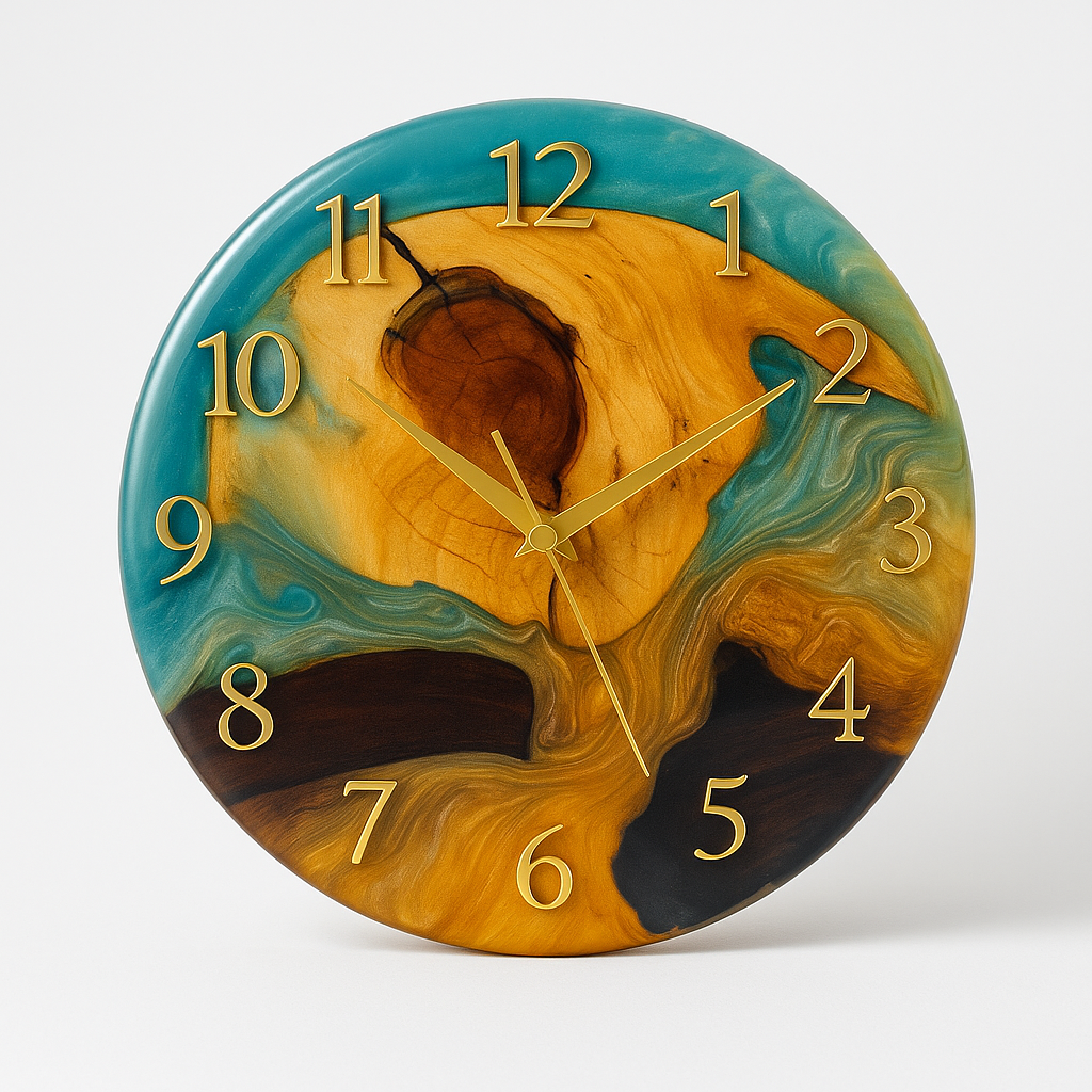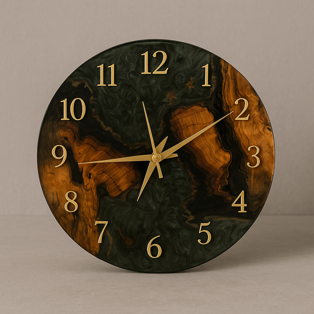 Add a touch of luxury to your space with this12″ handcrafted epoxy resin and natural wood wall clock. Each piece features a unique resin pattern and rich wood grain, complemented by elegant gold numbers and hands. Designed with a silent quartz movement, it runs smoothly without ticking noise — perfect for your living room, office, or bedroom. A stylish blend of art and functionality, this wall clock makes any wall stand out beautifully. Each clock may look slightly different because of the natural variations in the wood grain, making every piece truly one of a kind.