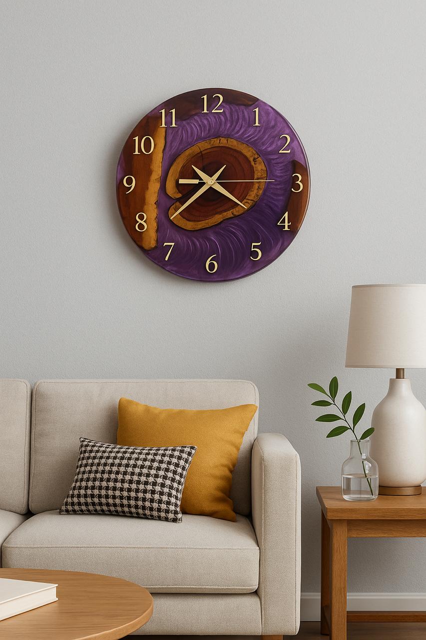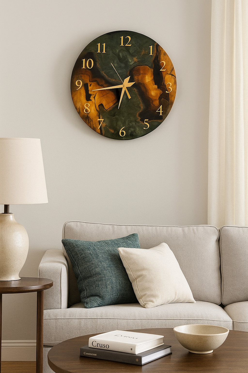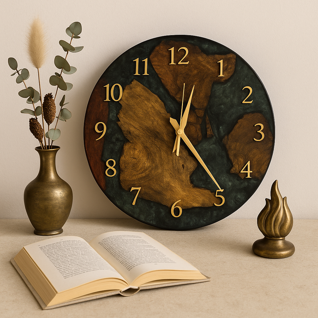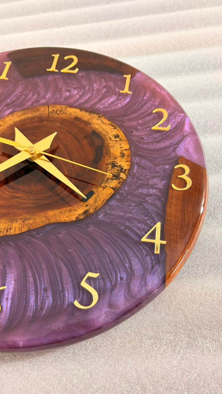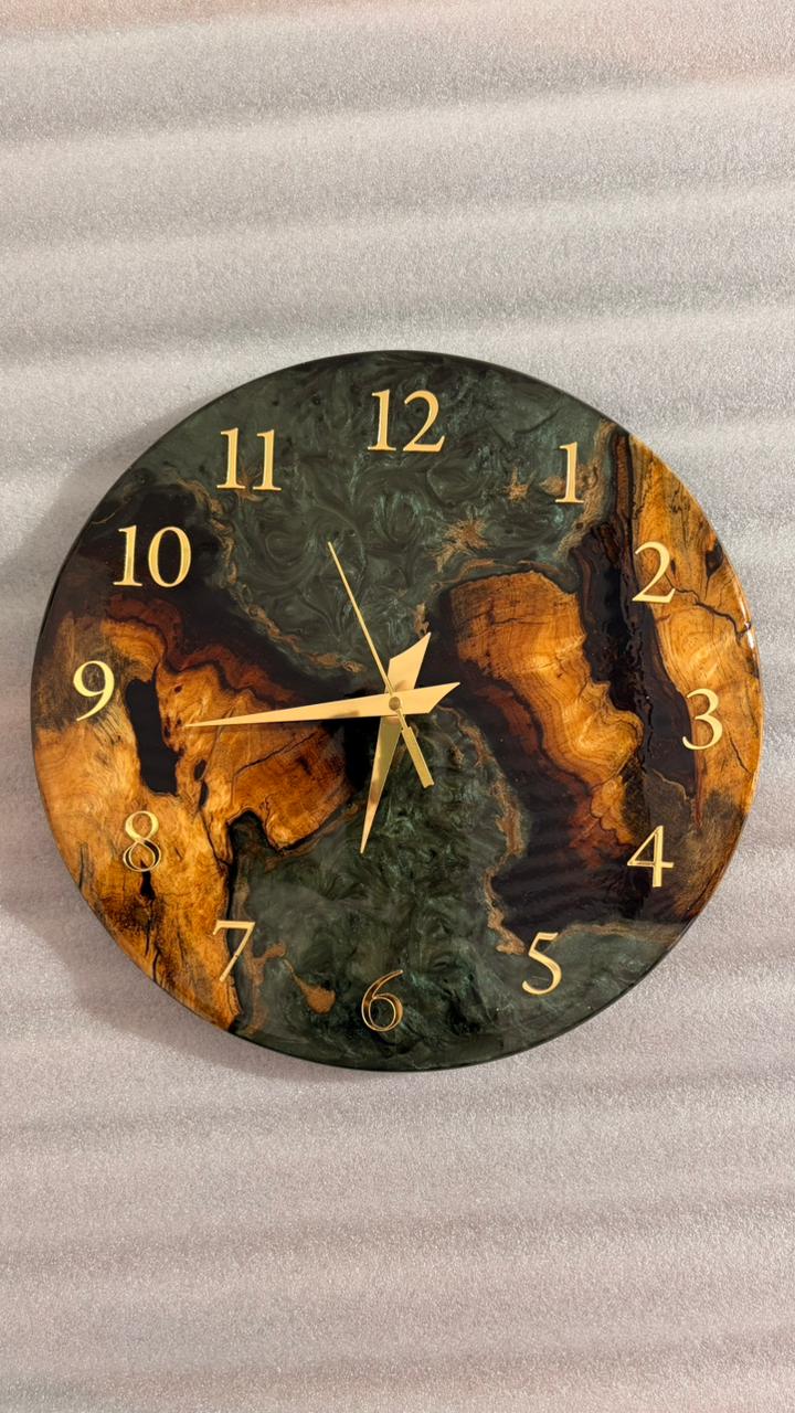 Add a touch of luxury to your space with this12″ handcrafted epoxy resin and natural wood wall clock. Each piece features a unique resin pattern and rich wood grain, complemented by elegant gold numbers and hands. Designed with a silent quartz movement, it runs smoothly without ticking noise — perfect for your living room, office, or bedroom. A stylish blend of art and functionality, this wall clock makes any wall stand out beautifully. Each clock may look slightly different because of the natural variations in the wood grain, making every piece truly one of a kind.