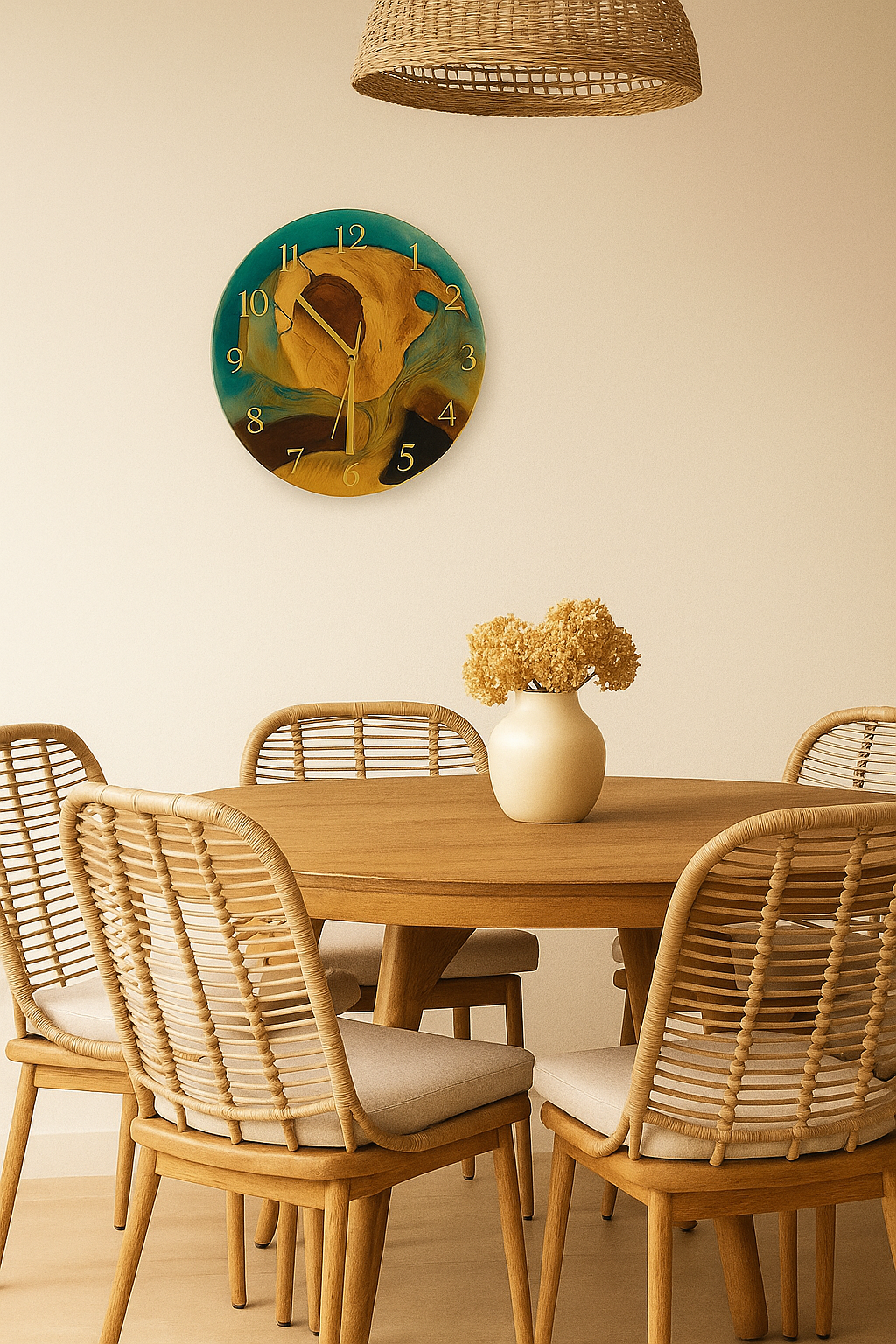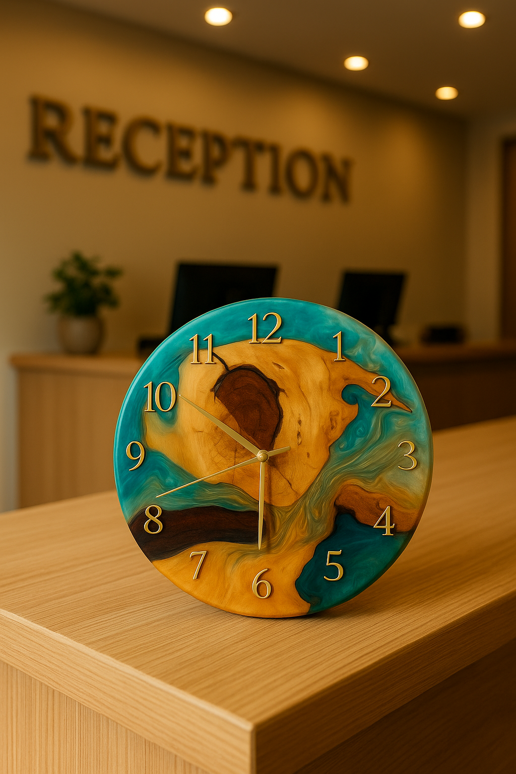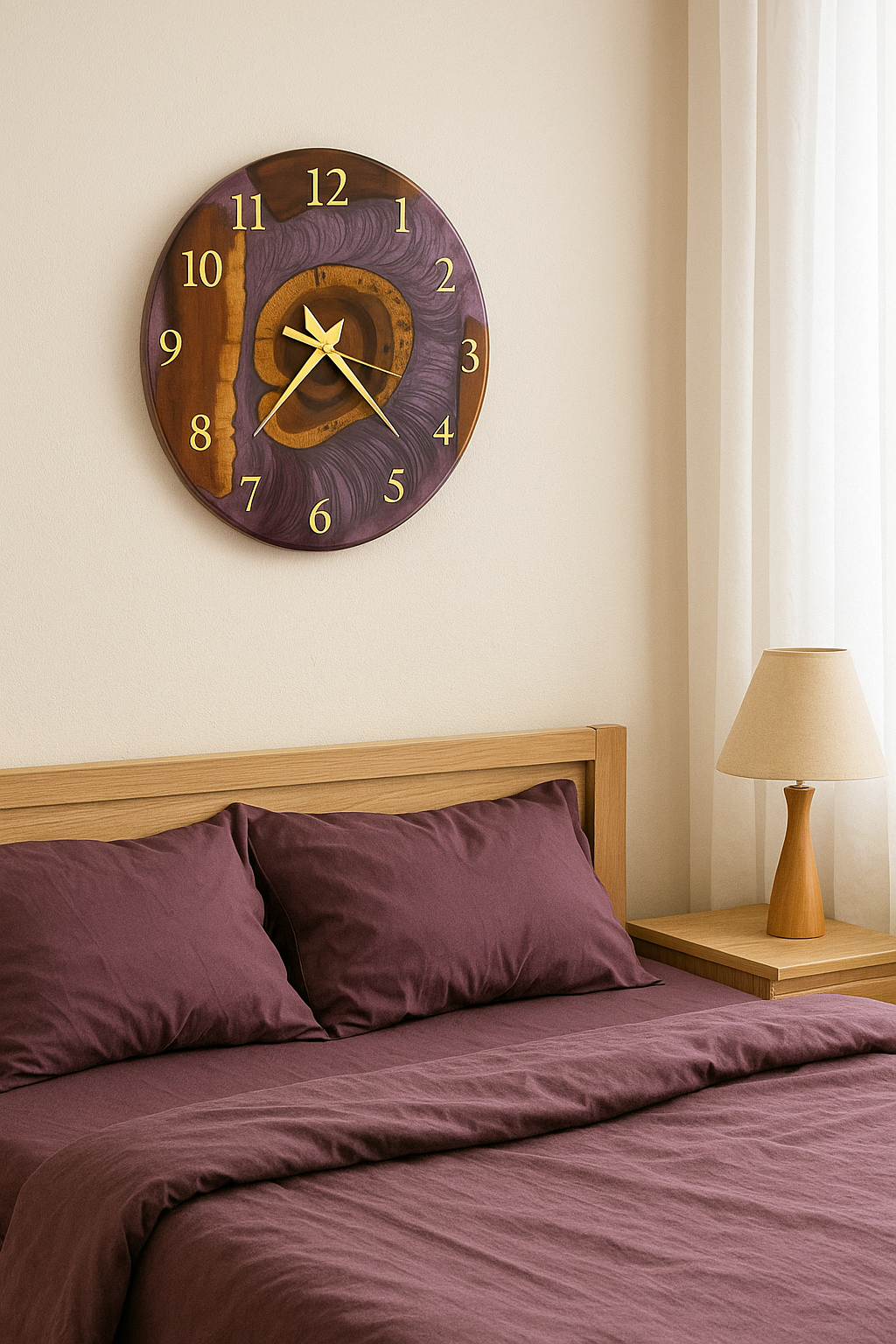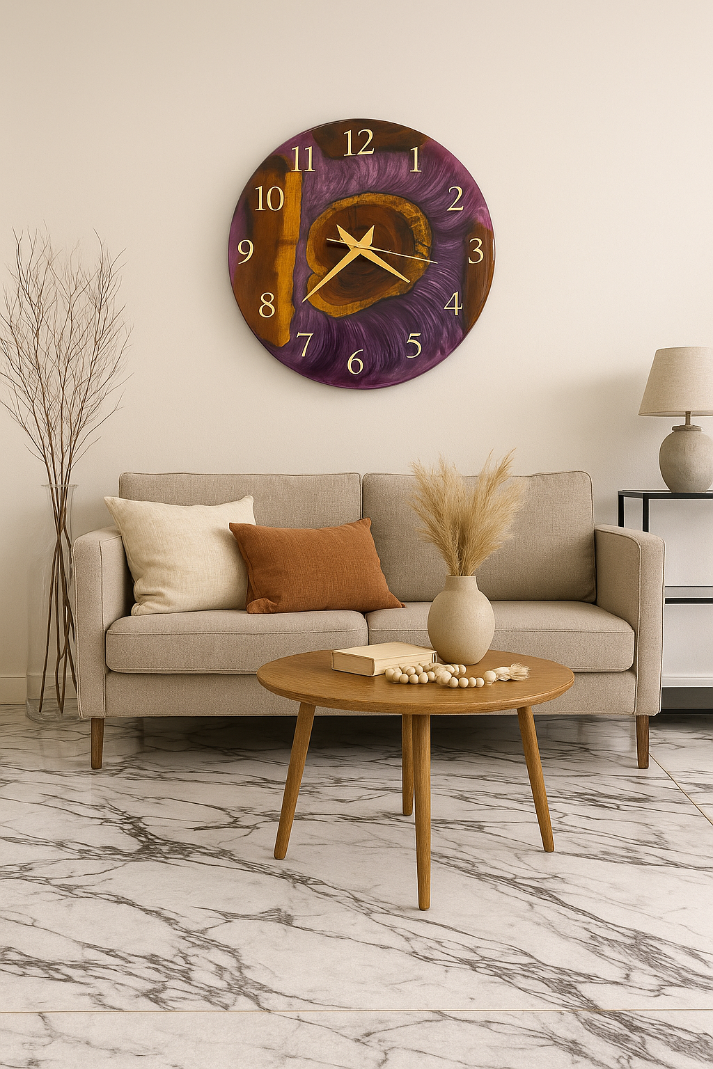 Add a touch of luxury to your space with this12″ handcrafted epoxy resin and natural wood wall clock. Each piece features a unique resin pattern and rich wood grain, complemented by elegant gold numbers and hands. Designed with a silent quartz movement, it runs smoothly without ticking noise — perfect for your living room, office, or bedroom. A stylish blend of art and functionality, this wall clock makes any wall stand out beautifully. Each clock may look slightly different because of the natural variations in the wood grain, making every piece truly one of a kind.