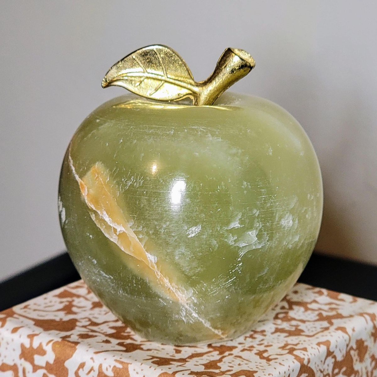 Venktesh Design Bring luxury and elegance to your space with this handcrafted Onyx Marble Apple Paperweight. Made from natural onyx stone, each piece has its own unique shades and patterns, making it a one-of-a-kind décor accent. The glossy finish and golden leaf design showcase premium craftsmanship that suits modern, classic and luxury décor themes. This marble apple can be used as a decorative showpiece, desk organizer paperweight, centerpiece décor, and a gifting item for all occasions. A stylish and timeless accessory for your home, office, hotels, or restaurants. Size 2.5″