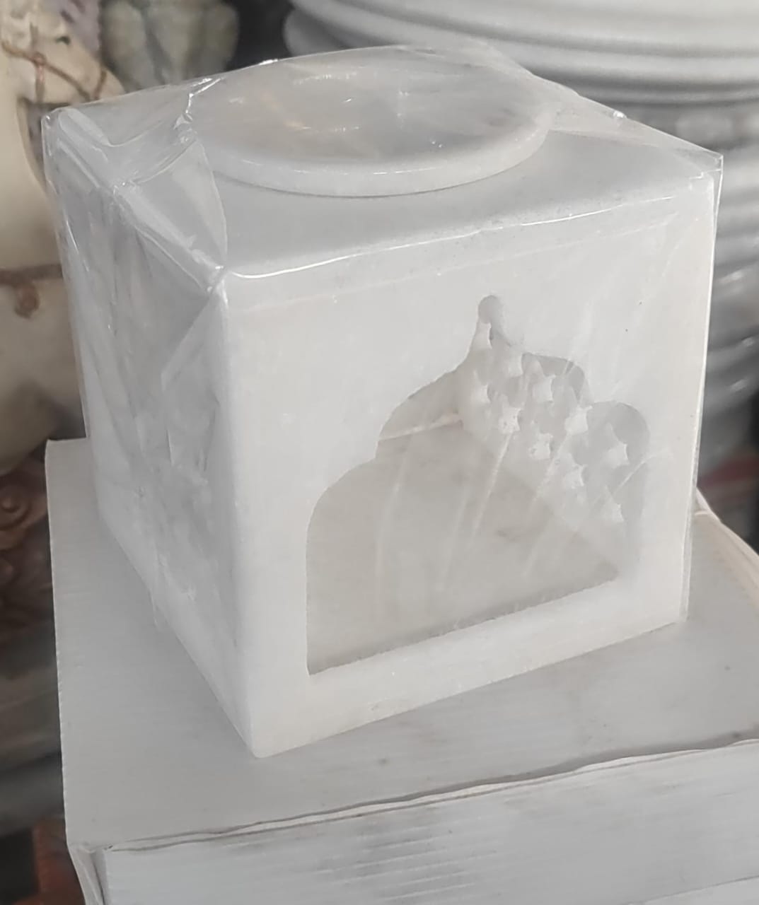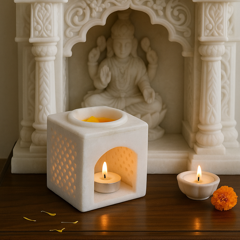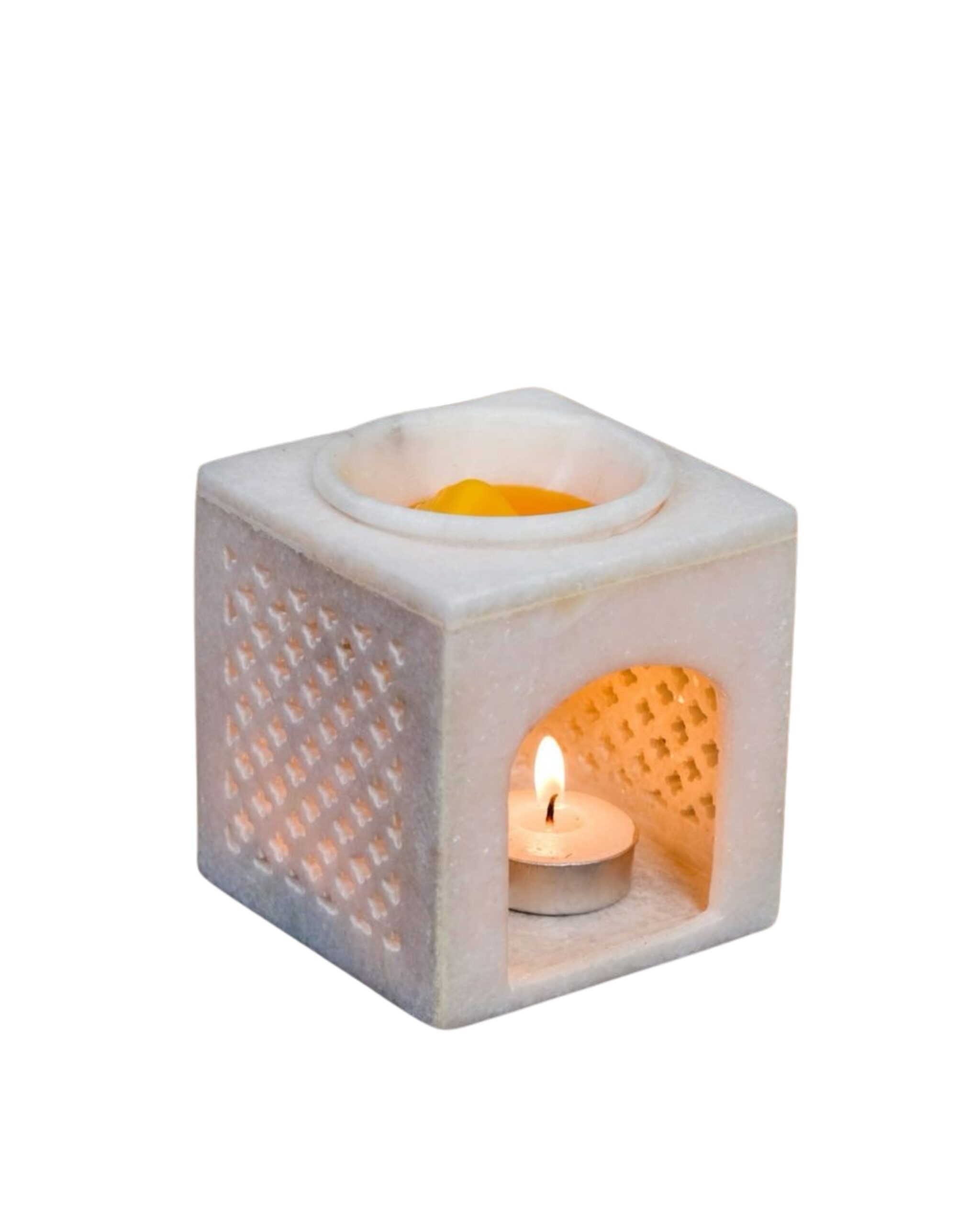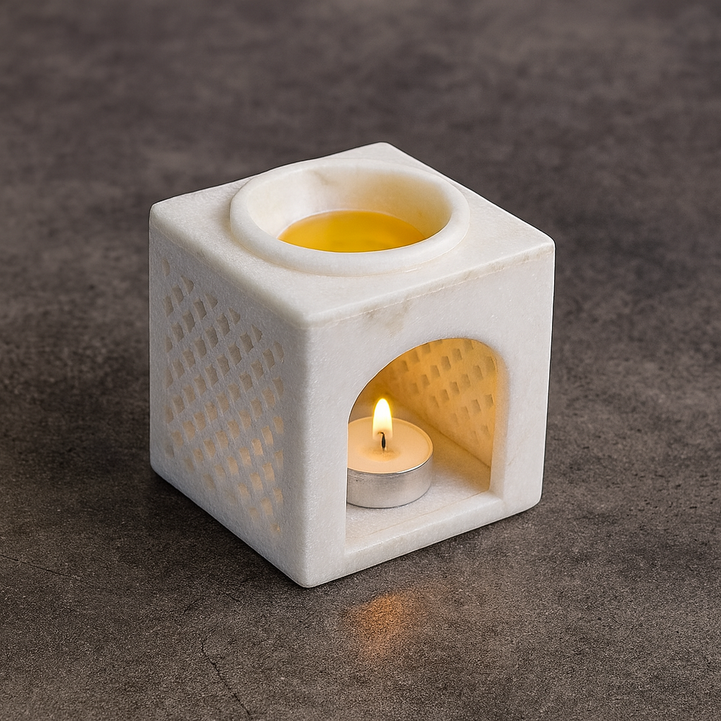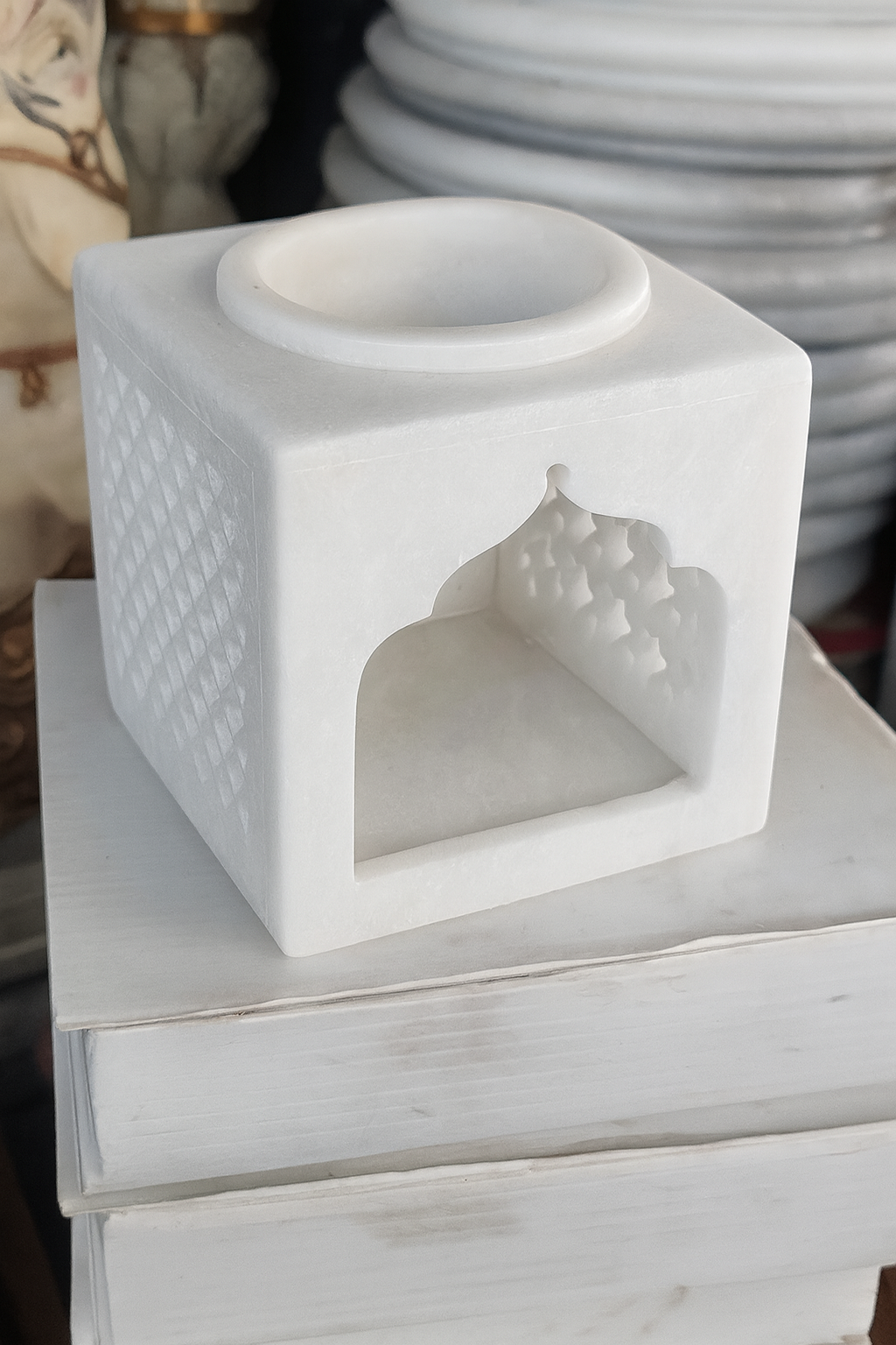 Bring home the calming fragrance of essential oils with this Handcrafted White Marble Aroma Oil Diffuser. Made from premium natural marble, this diffuser features a carved arch pattern and a spacious tealight holder that distributes heat evenly for maximum aroma. Ideal for use in the living room, bedroom, spa, meditation corner, office, or pooja room, this diffuser enhances your décor while promoting relaxation and wellness. It also makes a great gift for housewarming, festivals, Diwali, and special occasions. Venktesh Designs Handcrafted White Marble Aroma Oil Diffuser | Tealight Essential Oil Burner for Home Fragrance